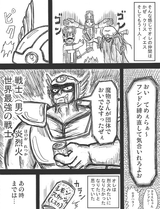 そんな感じでオレの仲間は かぜ クリス イエス そしてもう1人… 《ゴン》 《ゴン》 《ピク》 おい てめぇらぁ〜 フンドシ締め直して気合入れろよお クリスちゃんフンドシ… セクハラ! 魔物さんが団体でおいでなすったぜぇ 戦士(男) 炎烈火{ほのおれつか} 世界最強の戦士 オレは烈火みたいになりたかった なりたいと思っていた 《カラン》 レモンスカッシュ(レスカ) あの時 までは… |