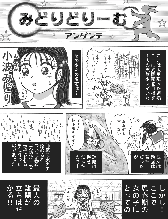 みどりどりーむ アンダンテ ここは人里離れた道場 ここに武闘家を目指す1人の天然少女がいた オナ! ニーキック! オナ! ニードロップ! 《ゴンッ》 その少女の名前は… 小波{おなみ}みどり ふぅ 彼女は勉強は苦手だったが─ 国50 数40 理30 社20 英10 (おお何も言えない…) 運動は得意だったので─ (オナ! 超キモチイイ!) 師範に実力を認められ ついに奥義 「気功波」を伝授される事になったのであった! ワ〜イ しかし! ここで思春期の女の子にとっての えっ そんな… 最大の難関が立ちはだかる!! |